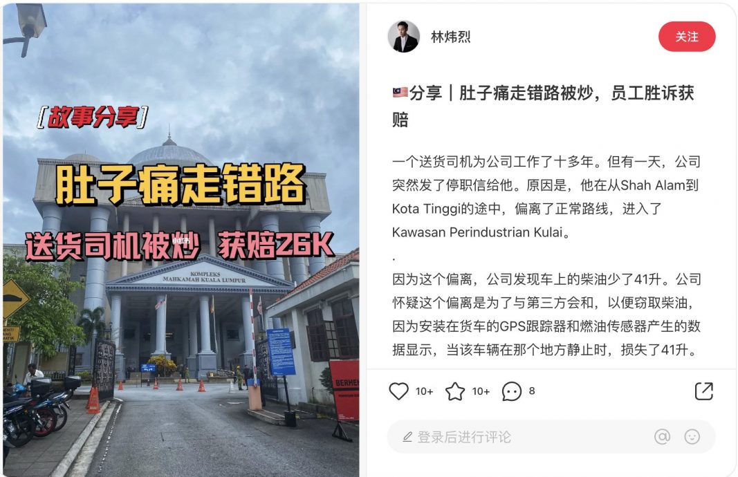 大马律师林炜烈在小红书贴文,指一名有10多年送货经验的货车司机,在一次从沙亚南出发到柔佛哥打丁宜途中,偏离了平时路线,驶进古来工厂区域。