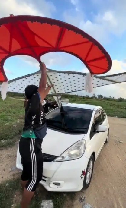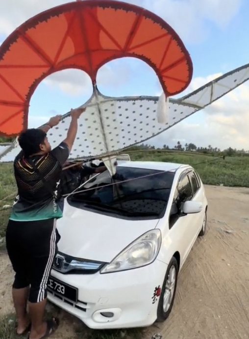 近日,丹州一名男子开车到瓜拉伯阿末河口(Kuala Pak Amat)散心,还来不下车欣赏美丽风景时,突然天降横祸,一个疑似断线的巨型传统风筝直坠而下,穿破男子的本田白色Jazz轿车司机座位车镜,差点刺穿男子胸膛。