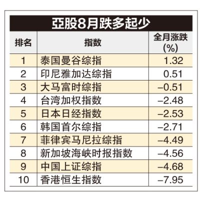 联储局鹰派态度不改,亚洲股市8月走势跌多起少,唯有泰国和印尼力保不失,大马则以0.51%跌幅排在第三位。