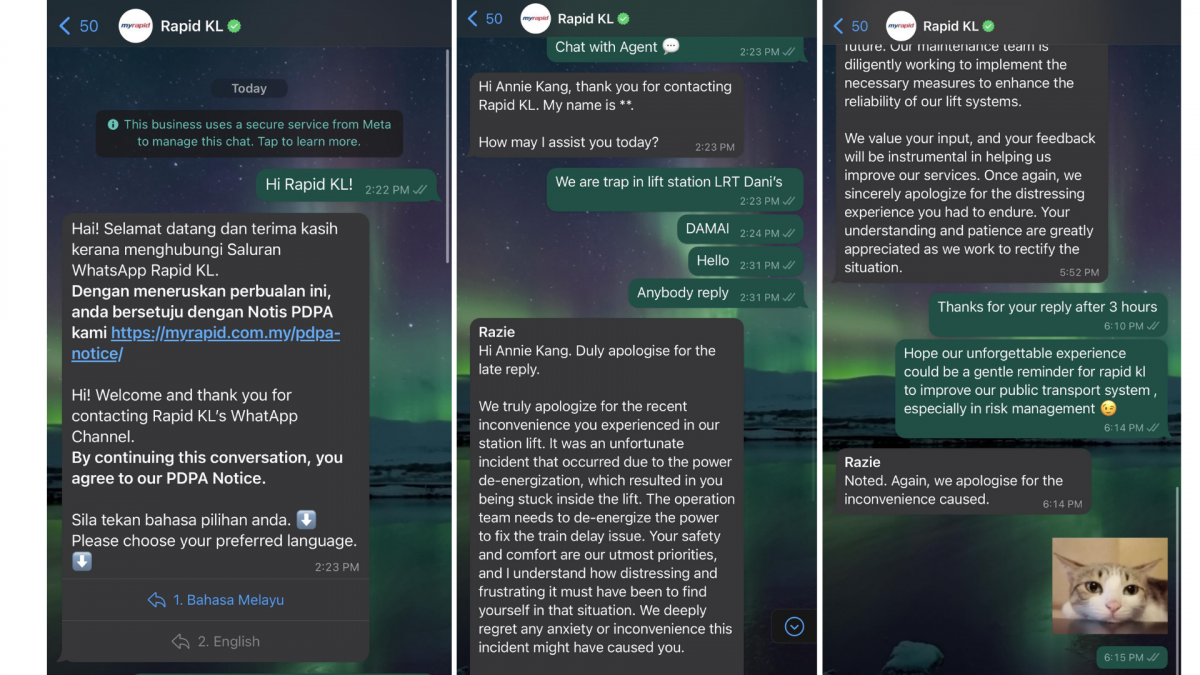 江玮葶说,她在事发后3小时,也就是一家人已经回到家,在脸书发帖分享此事并标记陆兆福及Rapid KL后,才收到Rapid KL的WhatsApp回复。