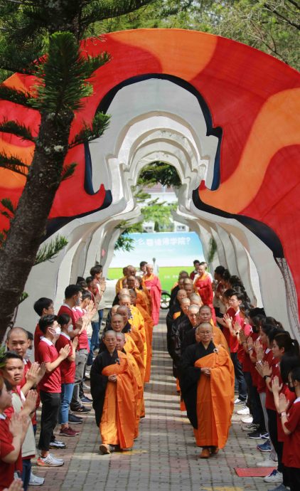 僧众托钵队伍缓缓步行到佛光广场举行的斋宴接受应供,同时响起了廿四节令鼓的鼓声,十分振奋人心,也更增添热闹。