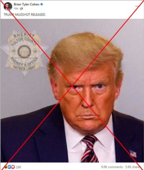 一位激进派美国Youtuber在脸书上贴出一张特朗普的大头照,照片中含有富尔顿郡治安官办公室的标志,他声称这是特朗普的监狱大头照。