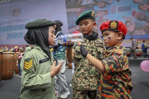希雅艾莎(左起)与两名表兄弟莫哈末丹尼尔、莫哈末达尼斯化身小小士兵和消防员现身国庆庆典,吸引众人的目光。 希雅艾莎的父亲莫哈末诺哈菲兹(35岁)告诉马新社,他花了300令吉购买制服,并且凌晨3时就来到布城广场,以便有个好位置全程欣赏国庆游行和节目。 (马新社图)