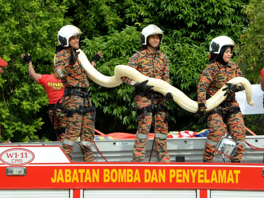 平日把消防喉扛在肩上的消防员在国庆日当天转而把蟒蛇挂在身上,吸引现场民众尖叫声连连。(林明辉摄)