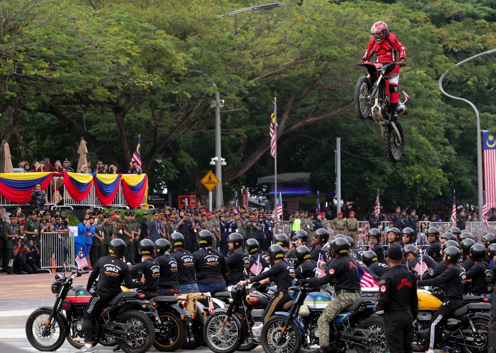 陆军中士赛达都以250cc的摩托车在国庆庆典上表演飞跃摩托车特技。(马新社图)