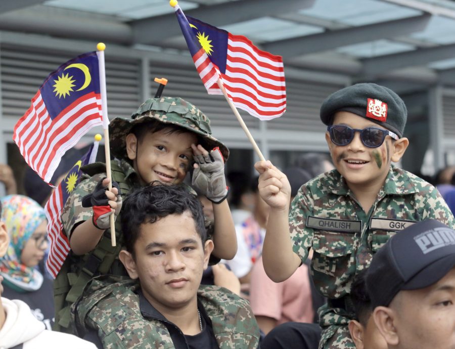 群众在国庆庆典上挥舞国旗,现场形成一片旗海。(图:马新社)