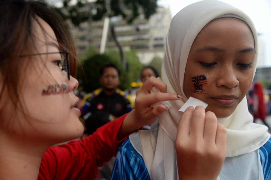 莅临现场的民众除挥舞国旗外,也有人在脸颊贴上纹身贴纸。