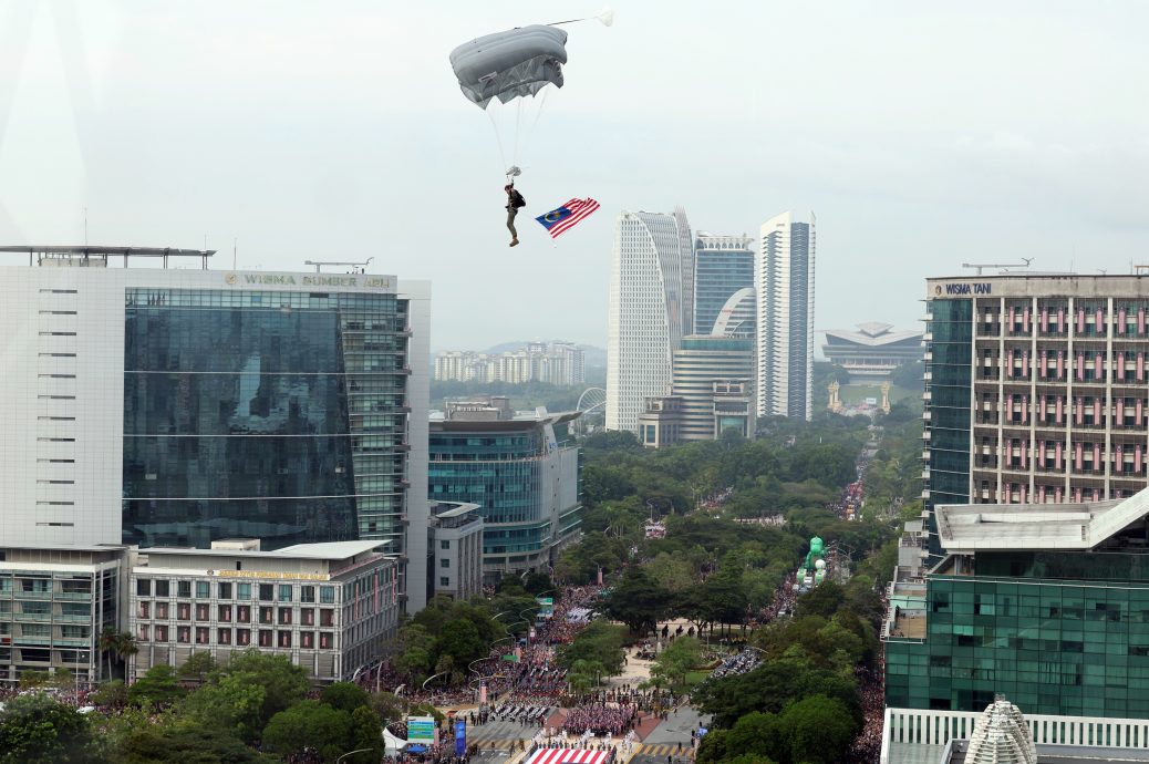大马皇家警察于国庆庆典当天展示跳伞技术,在天空飞行一段时间后顺利降落于指定地点,博得众人喝彩。(蔡伟传摄)