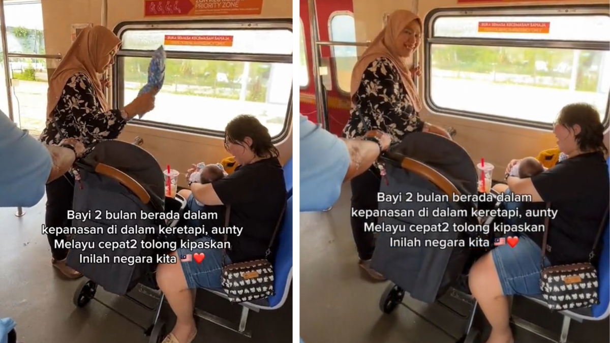 (吉隆坡31日讯)华裔妇女抱着孩子乘搭火车,而火车上因太热孩子在哭泣,马来大婶见状立即到一旁帮忙扇风,这一画面瞬间触动全马人民的心。