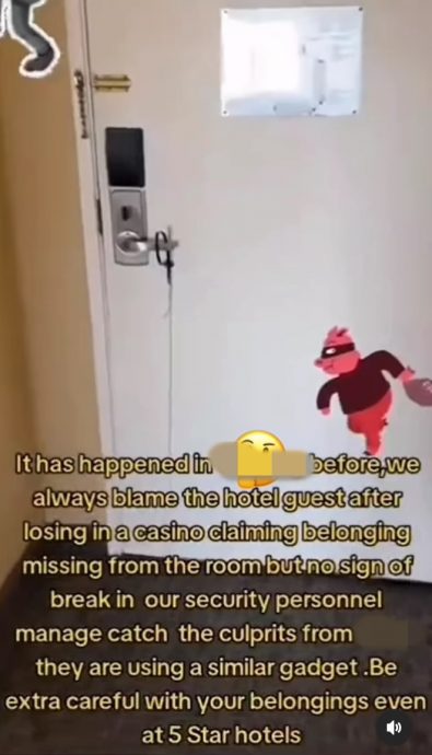 根据网媒“Majoriti”在Instagram上转发的视频,一名住客在酒店房间休息时,发现有人在房门外,正利用其特制的绳索和扎带,通过门缝伸入进来打开房门。