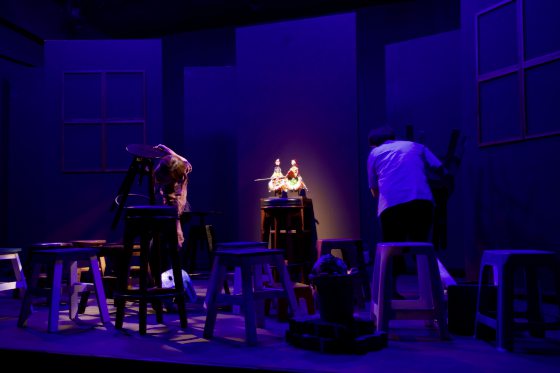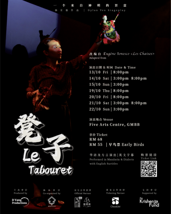 《凳子》是一部改编自荒诞剧剧作家Engene Ionesco剧本《Les Chaises》的舞台剧。在新晋剧场导演Dylan杨宏强的版本里,则加入了马来西亚传统表演艺术——布袋戏的元素。