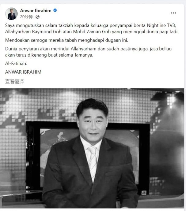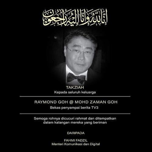 (八打灵再也12日讯)资深英语新闻主播Raymond Goh上个月30日因中风被送院,在与病魔搏斗14天后,并于今早10时43分宣告不治离世,享年62岁。首相拿督斯里安华、数字通讯部长法米和其生前任职的TV3电视台都特地发文致哀。