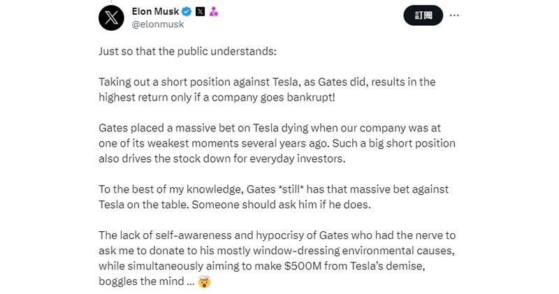 马斯克发表帖文指:“像盖茨那样做空特斯拉,只有在公司破产的情况下才能获得最高的回报!几年前,当特斯拉处于最疲软的时刻时,盖茨对特斯拉的死亡下了巨大的赌注。如此大的空头仓位也会导致普通投资者的股票下跌。”