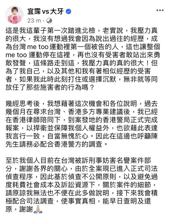 她随后透过脸书发文,坦承自己压力非常大,也没想过说出个人经历成了台湾Me Too里第一个被告的人:“这也让整个me too 运动停在这里,再也没有受害者敢站出来勇敢发声。”但她认为这不只是为了自己,也是为了其他有相似经历的受害者,若就此打住或选择沉默就会是放任施害者的行为。