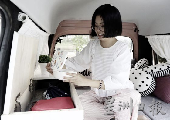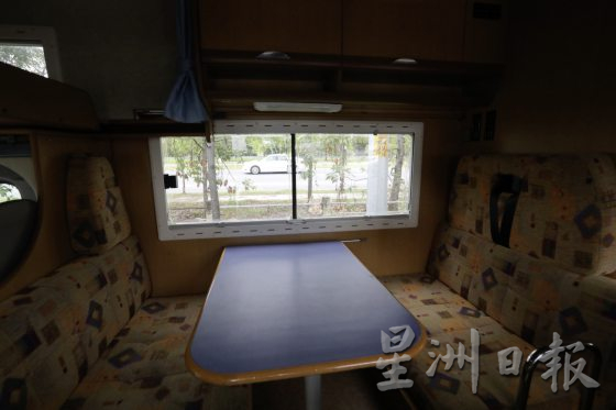 叶永衾在改造露营车时也曾咨询过陆路交通局,总结得出是橱柜的高度不得超过车窗,后车厢需保留至少一排座位等等以符合安全考量。右为刘芳贤。