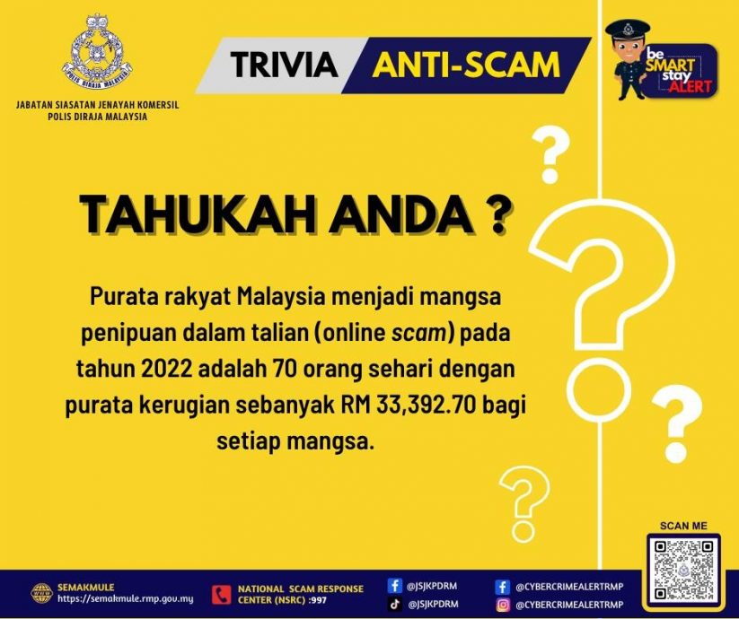 据武吉阿曼警察总部商业罪案调查局2022年统计显示,1天平均共有70人受到诈骗,每个受害者平均受诈骗的金额是3万3392令吉。