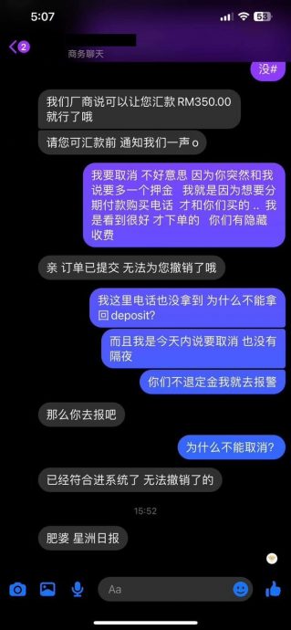 “在第三次被对方要求支付550令吉的抵押金时,我身上已经没有如此多的资金,而且开始觉得对方不诚实,因此想取消订单,但遭到拒绝。”