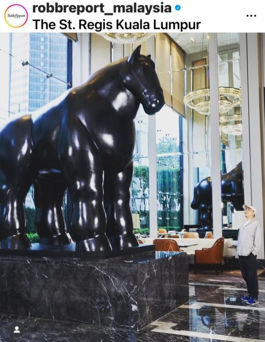 其中矗立在瑞吉酒店大厅中央的作品,是一座2.5吨及高达3.6公尺的铜马雕塑,也是波特罗当时创作最巨大的作品“波特罗马”(Botero Horse)。