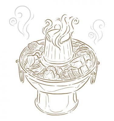 南宋流传下来的食谱《山家清供》中,就提到宋人料理火锅食材的方法。相传中国南方的雪天里,林洪在武夷六曲抓了只兔子,山里渺无人烟没有厨师可料理,于是便打了主意将风炉置放座上,把兔肉切成薄片用酒与香料腌制,水滚后夹起兔肉片涮着吃。北方更有人把用羊奶饲养长大的貔狸,也就是黄鼠肉加入鼎中,慢火炖得酥烂。