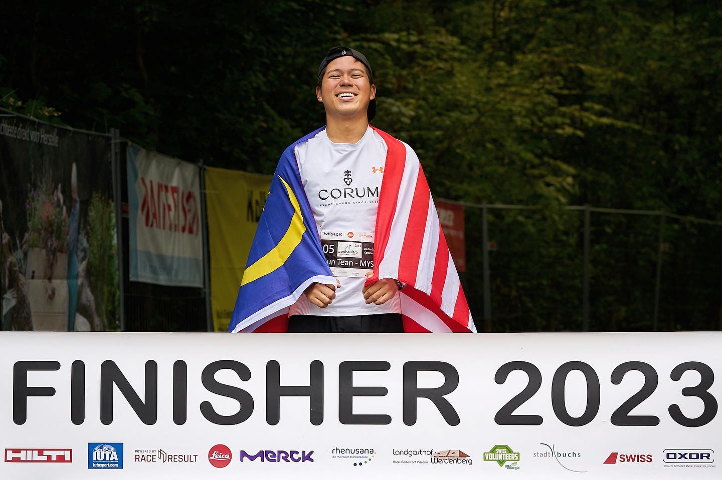刘俊腾很开心完成艰苦的844公里跑步,手持国旗庆祝。(瑞士超级铁人三项官网照片)