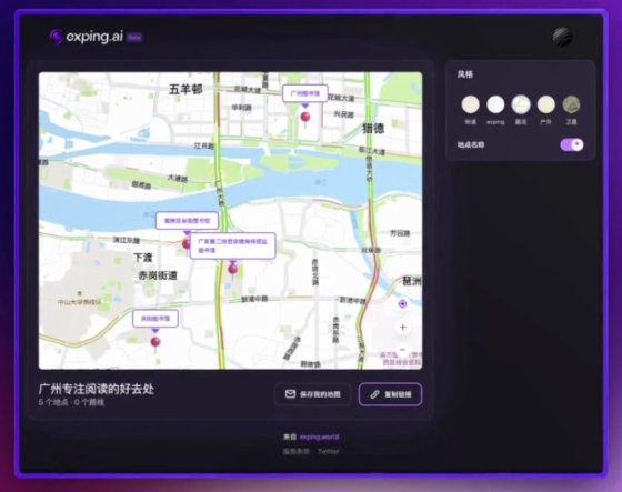 “AIGM”打破了传统地图搜索的用法,它允许用户用自然语言描述的方式去生成地图。比方说输入“广州适合专注阅读的地方”、“有花花草草适合散步的地方”、“附近适合带父母走走的地方”这些句子,Exping便会依据这些特征生成一系列的地点。