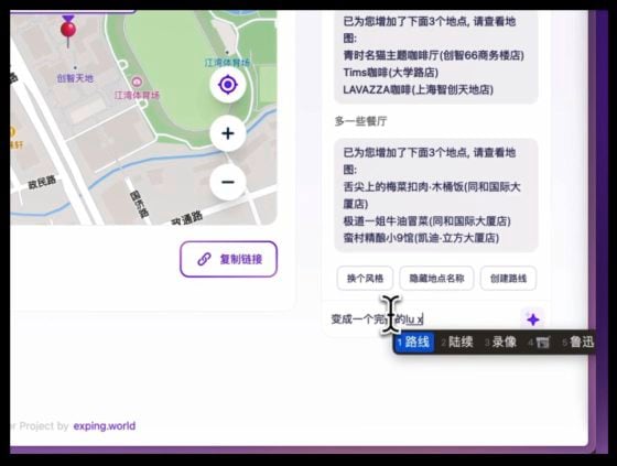他说,如果要求ChatGPT生成一个出游行程,可能会不准确,甚至生成一些不存在的地点。而Exping不同之处是,它结合自身现有的数据,然后生成一个地图。