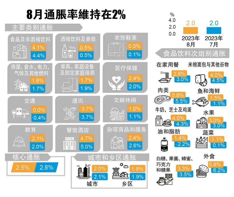 不过,我国今年首8个月的通胀率达2.8%,比起去年8月为3.1%,主要还是受到餐馆酒店(上涨6.2%)及食品及非酒精饮料(升高5.7%)价格走高带动。