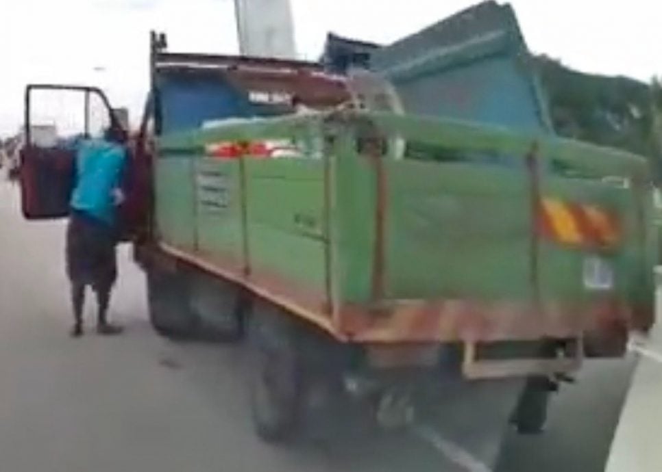 只见从罗里掉下的男子及时反应,也赶快从马路上站起来,再回到罗里内,才不至于造成人命的伤亡。