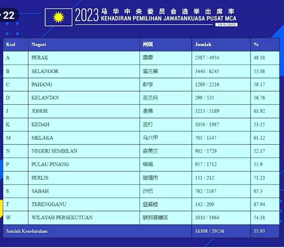 根据马华总部现场荧幕显示,符合投票资格的区会代表有2万9156人,出席投票人数为1万6308人,投票率为55.93%。
