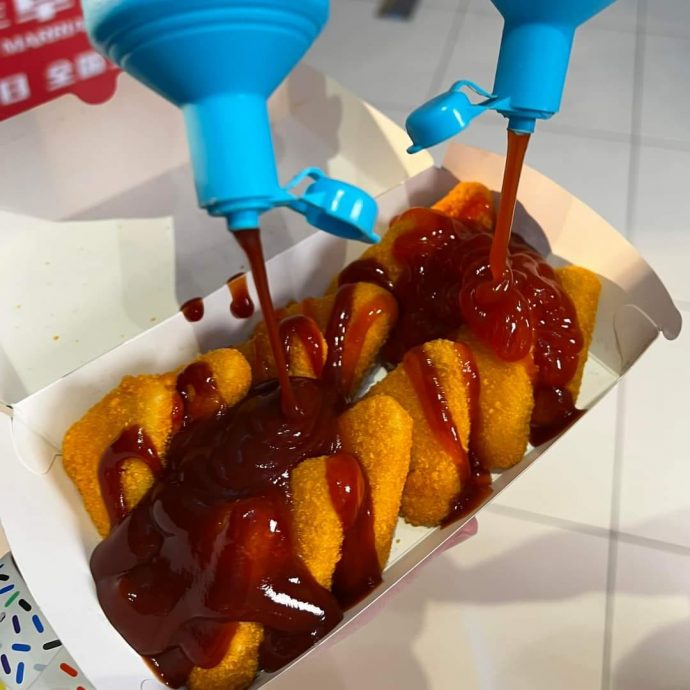 该贴文更配上挤上满满辣椒酱和番茄酱的鸡块(Nugget)的图片。