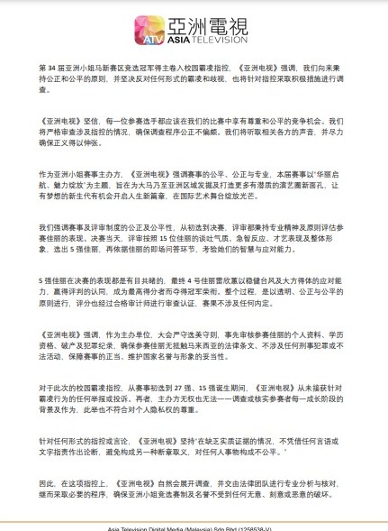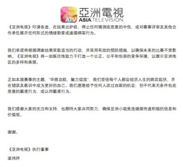《亚洲电视》执行董事梁玮玶发文告表示,该主办方秉持公正和公平的原则,并坚决反对任何形式的霸凌和歧视,也将针对指控采取积极措施进行调查。