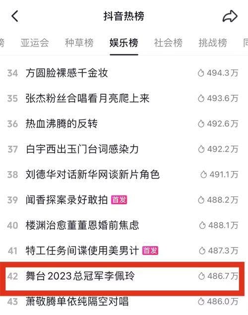 节目播出后,“舞台2023总冠军李佩玲”词条登上抖音热搜,观众纷纷留言恭喜李佩玲实至名归,“恭喜佩玲,大马之光继续加油”、“李佩玲真的很棒!也是实力远大于名气的歌手”、“佩玲值得”。