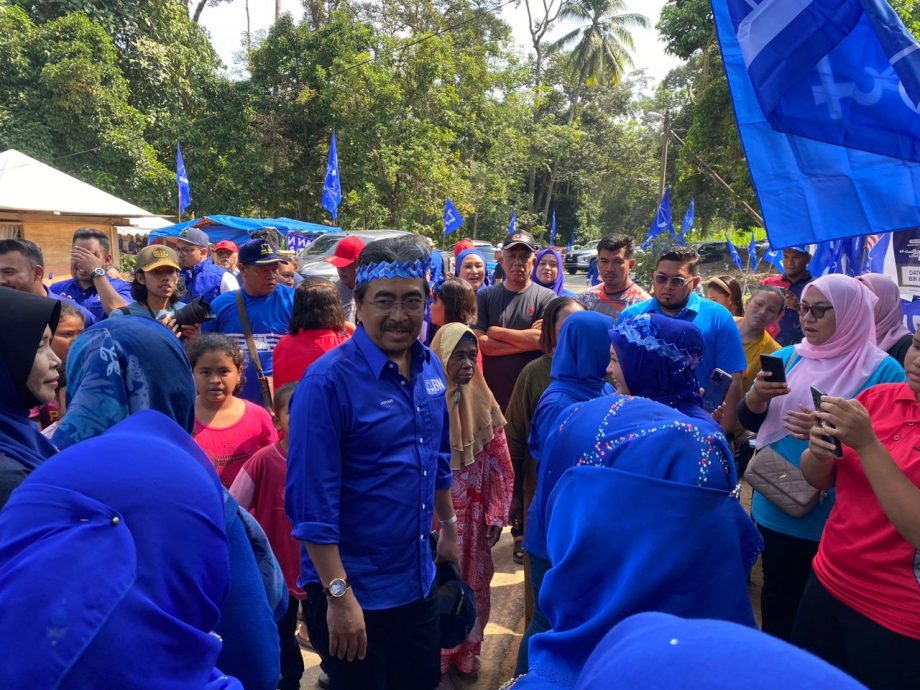 佐哈利(站中)拜访原住民村,为柏朗埃州席补选的国阵巫统候选人拿督阿米扎拉票。(取自网络)