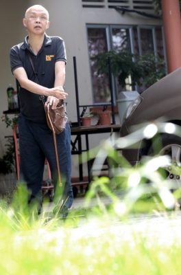 积极接受物理治疗的陈锦辉,目前已可以靠着拐杖步行。
