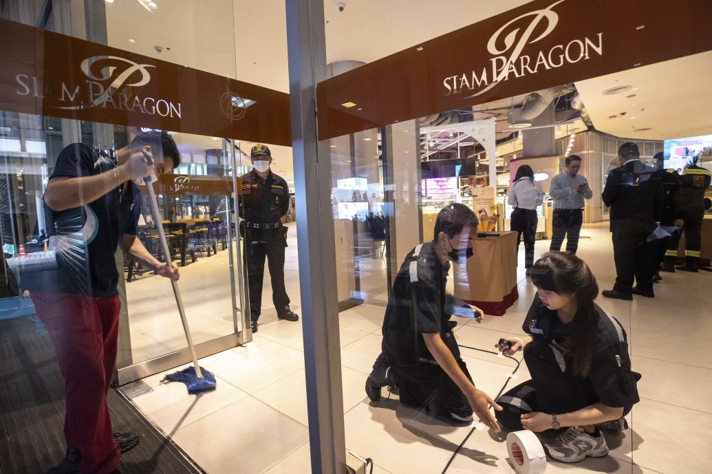 图为暹罗百丽宫员工在商场开门营业前仔细检查金属感应器,加强安检工作。(Thaiger/mgronlin)