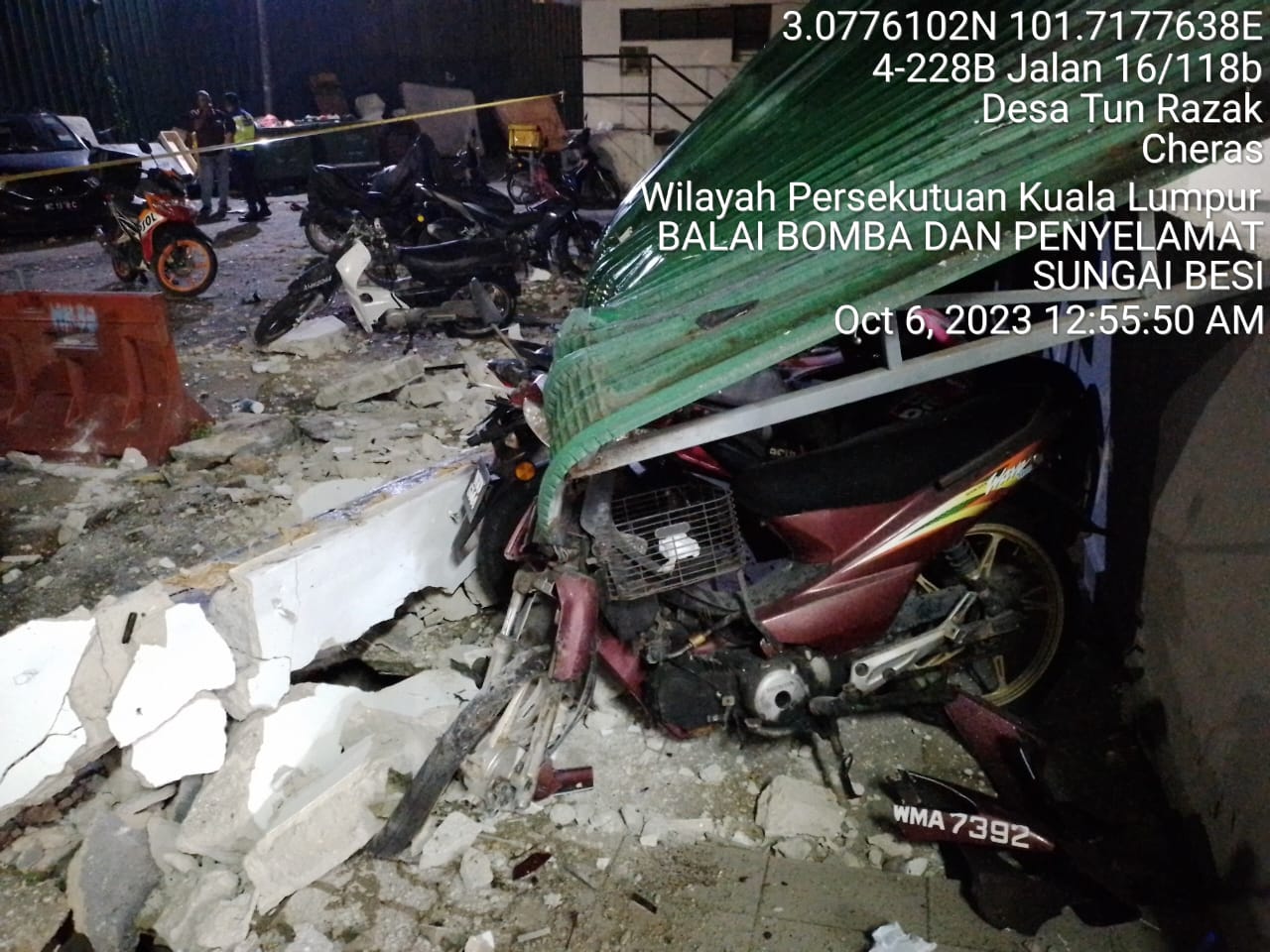 停在公寓底层的多辆摩托车被掉落的厨房墙面碎片砸中。(消拯局提供)
