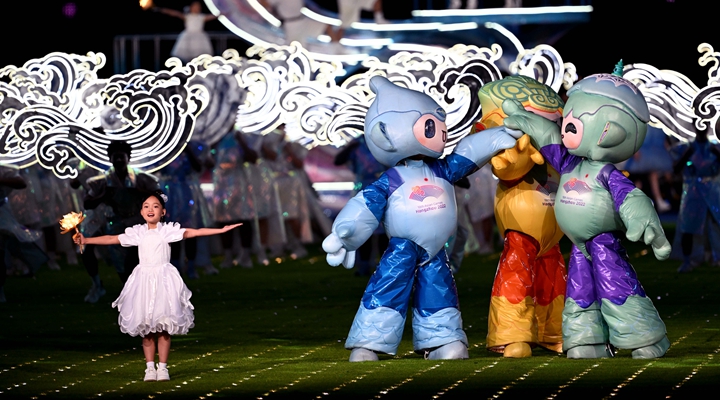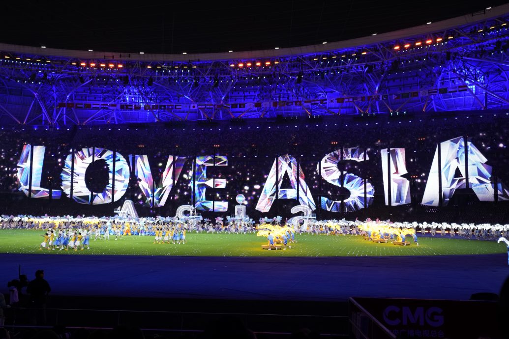 尾声节目《心心共相融》更像是一场嘉年华,参赛运动员、志愿者们聚在数控草坪“亚洲花园”里载歌载舞,构建一幅人与自然和谐共生画面。