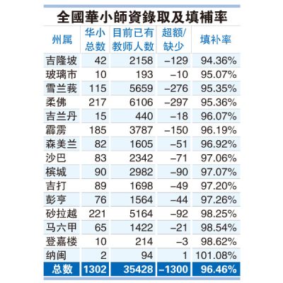 她今日发文告说,目前全国1302所华小共缺少1300名教师,当中的柔佛、雪兰莪、霹雳和吉隆坡缺少逾百名教师。