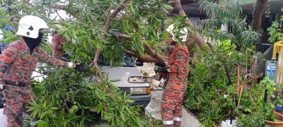 雪州消防与拯救局发文告说,该局今午4时59分接获首宗投报,甘榜巴耶加拉斯发生倒树意外,1辆宝腾X50运动型休旅车路过上述地点时,遭倒树砸中,惟车内乘客只是虚惊一场,没有受伤。