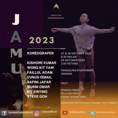 2023年JAMU将呈献由8位教师教师创作的8个涵盖各种不同主题、思想和灵感的全新作品。这8位教师是黄歆颖(Ng Xinying)、黄结游(Wong Kit Yaw)、Murni Omar、Yunus Ismail、Safini Jafar、Steve Goh、Kishore Kumar和Faillul Adam。每支作品的长度介于8至10分钟,有独舞作品、双人作品、三人作品以及群舞作品。这些作品会由ASWARA的在籍舞蹈系学生、校友和教师联合呈献。