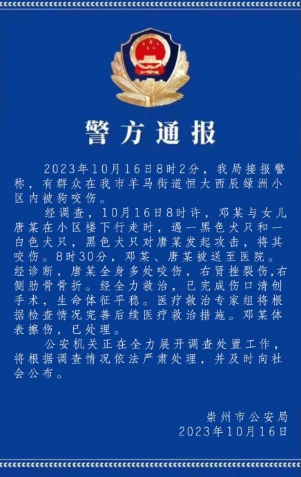 根据澎湃新闻报道,崇州警方当天通报称,邓某与女儿唐某在小区楼下行走时,遇一黑色犬只和一白色犬只,黑色犬只对唐某发起攻击,将其咬伤。上午8时30分,邓某、唐某被送至医院。