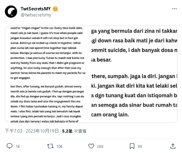匿名女子透过社媒X帐号@twtsecretsmy分享她的故事,希望借此警惕女生爱惜自身,勿向男子屈服,不要将自己交给不是丈夫的人。