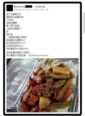 “右边这包素饭(一饭一蔬菜一素料)4令吉50仙,同样被顾客批评说贵,还说在其他地方买得到比你们便宜的,走人不要。”
