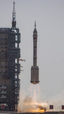在许学强下令“出发!”后,汤洪波、唐胜杰、江新林在欢送人群的欢呼下,从酒泉卫星发射中心问天阁外的圆梦园广场,登车前往发射场。