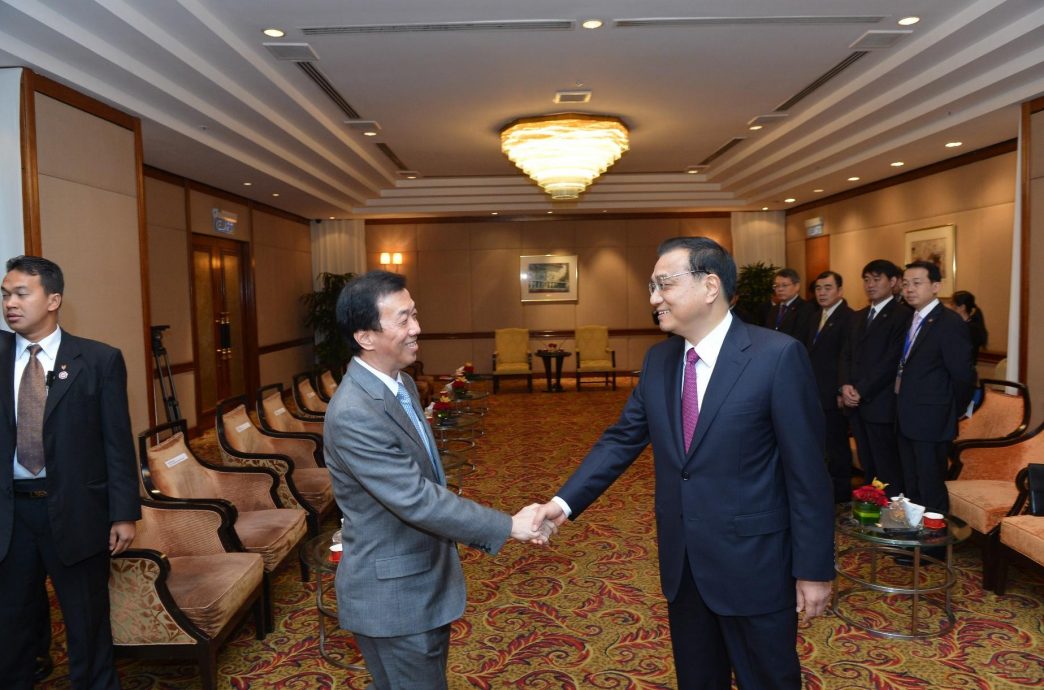 2015年李克强(右)在出席与10位大马著名企业领袖座谈会前,和黄家定握手问候。(照片由黄家定提供)