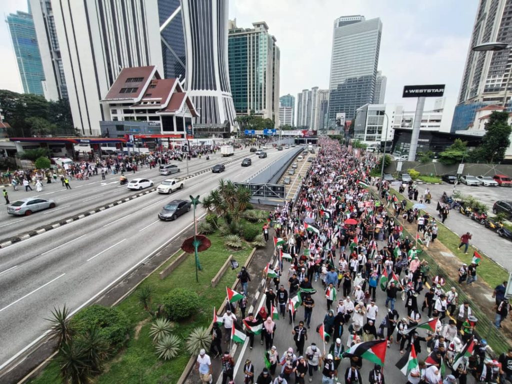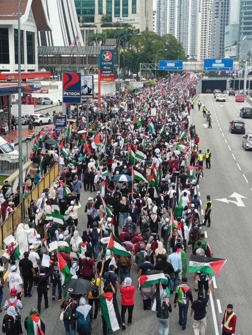 (吉隆坡28日讯)约5000人聚集在安邦路艾沙基林清真寺,参与“声援巴勒斯坦”集会,高举巴国国旗喊口号,一路游行到美国驻马大使馆。