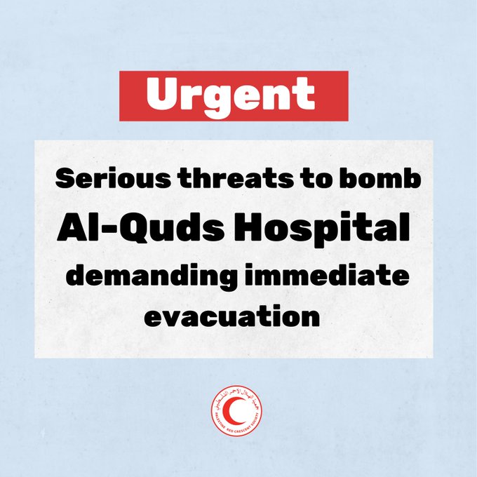 (加沙29日综合电)巴勒斯坦红新月会表示,他们已收到以色列当局的警告,要求立即撤离加沙地区的圣城医院,因为这间医院即将遭到轰炸。