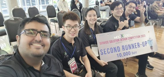 唯一代表马来西亚到泰国参加2023年服务解决方案设计比赛、并获得季军的APU队伍。左起为导师克里希纳、叶锦雄、杨雪莉、洪嘉泽和队长戴嘉骏。