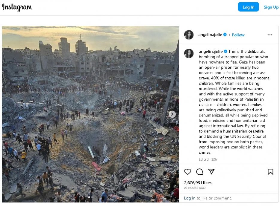 (纽约2日综合电)美国好莱坞著名女演员、前联合国难民署特使安祖莲娜1日在社交媒体Instagram上发文,谴责以色列攻击平民的行为违反国际法,并斥责与其沆瀣一气阻碍人道主义停火的其他国家领导人,是这些战争罪行的“同谋共犯”。
