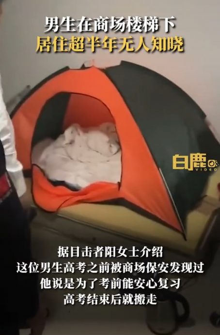 中媒《白鹿视频》报道,上海有名男子住在商场某处楼梯下超过半年,他是为了安心复习高考(大学入学考)而寄住在这里,当时曾被保安发现,只不过男子自称会在高考过后搬走。然而,在商场员工都以为他搬走半年后,却又被保安在前几天发现男子依然住在楼梯下。